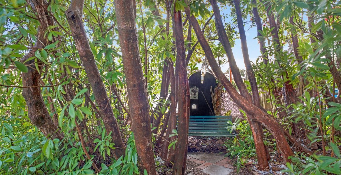 The front garden enjoys a hidden “contemplation seat” amongst the exotic plants in this enchanting garden.
