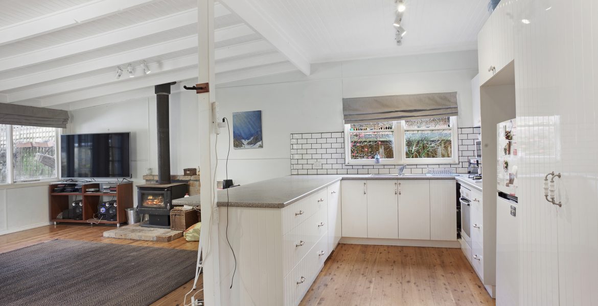 The ceiling of beams and weatherboard enhance the characterful and welcoming feeling of this room.