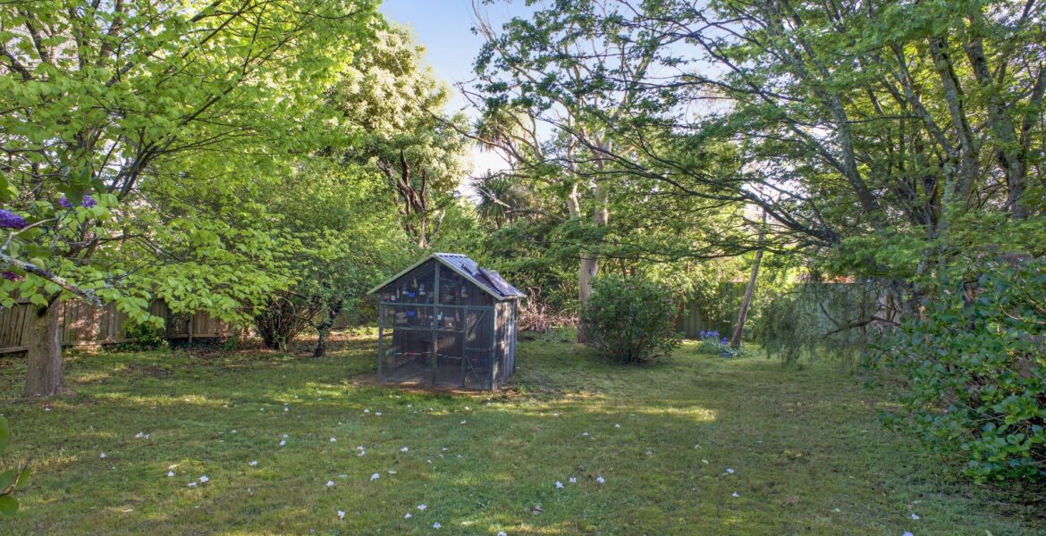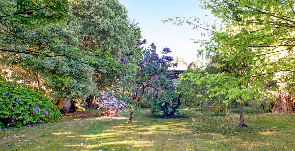 The well-established lawn has a lilac tree, wisteria, ‘champagne’ bush & pittosporum.