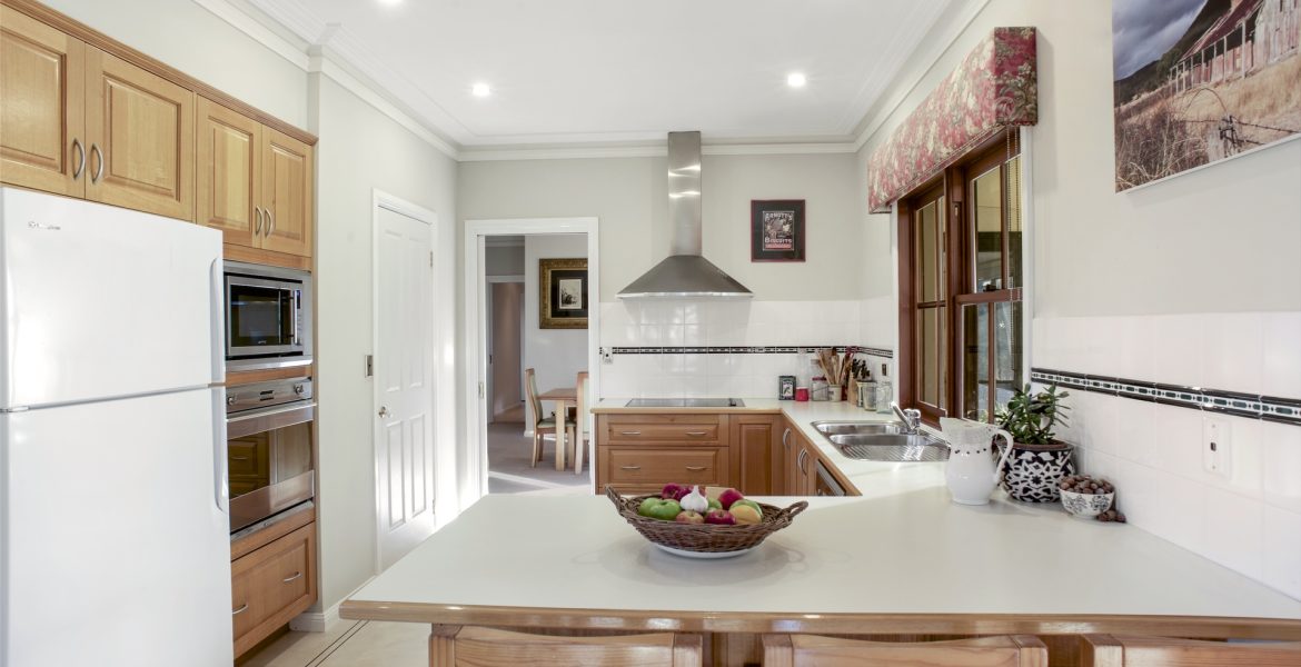 The kitchen features large walk-in butler’s pantry, Smeg appliances and Tasmanian Oak cupboards.