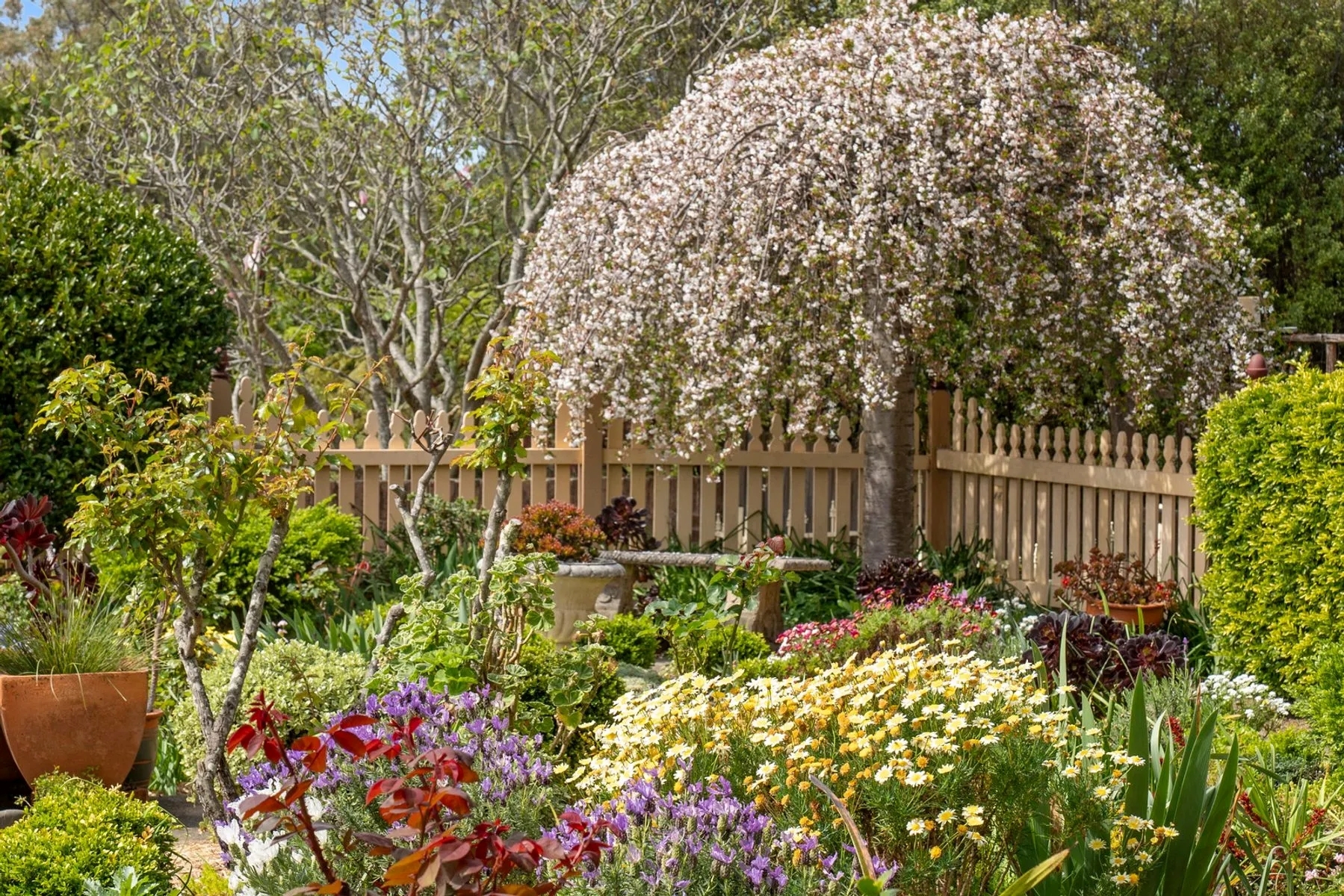 Outdoors, the lovely front garden greets with clever plant selection & presentation.